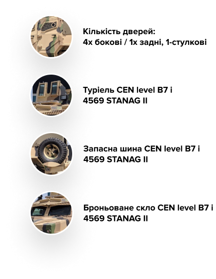 Бронований гігант мобільності та безпеки. З його внутрішніми розмірами і потужними конструкціями він здатний ефективно переміщатися по самим складним типам місцевості, забезпечуючи надійний захист і перевезення значущих вантажних навантажень. Незалежно від умов дороги або бездорожжя, ця машина готова виконати будь-яку поставлену задачу з неймовірною надійністю та продуктивністю.
